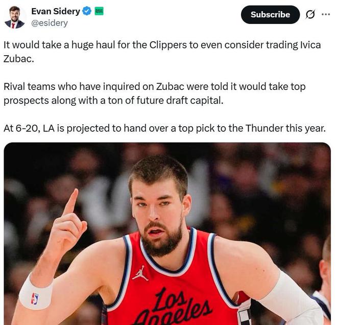 祖巴茨几乎成为快船队想要大改阵容唯一能动的球员,快船队记Iliyan Lakhani直言交易祖巴茨是快船队目前唯一的救命稻草,也是重建唯一的希望。