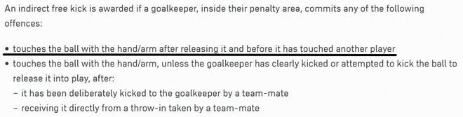 守门员在将球抛出或释放后,在球尚未被其他球员触及之前,用手或手臂再次触球。
